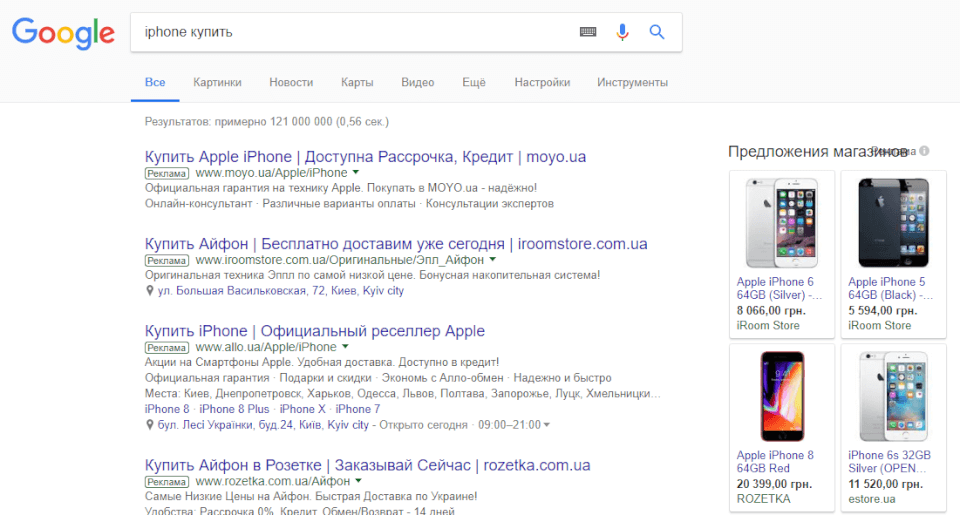 - Товарные объявления пока не так распространены, в Украине сервис запустился совсем недавно, поэтому конкуренция низкая и стоимость клика гораздо ниже, чем в поисковой рекламе.