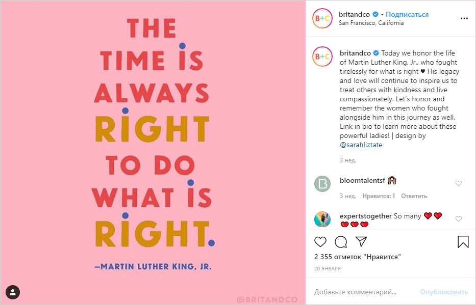 Пример просто и стильно оформленной цитаты от медиакомпании Brit+Co.