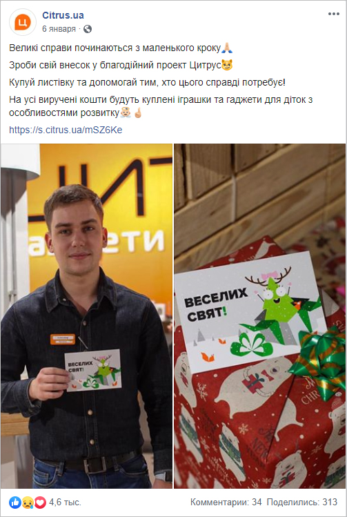 Интернет-магазин Citrus призвал покупателей принять участие в благотворительном проекте. Чтобы подчеркнуть свою «человечность», компания прикрепила фото сотрудника.