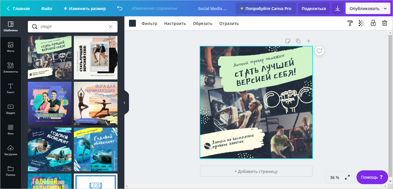 Можете использовать готовые шаблоны и загружать свои изображения. Удобно, что в бесплатной базе есть дизайны, заточенные под разные виды бизнеса, например турагентства, салоны красоты и тренажерные залы.