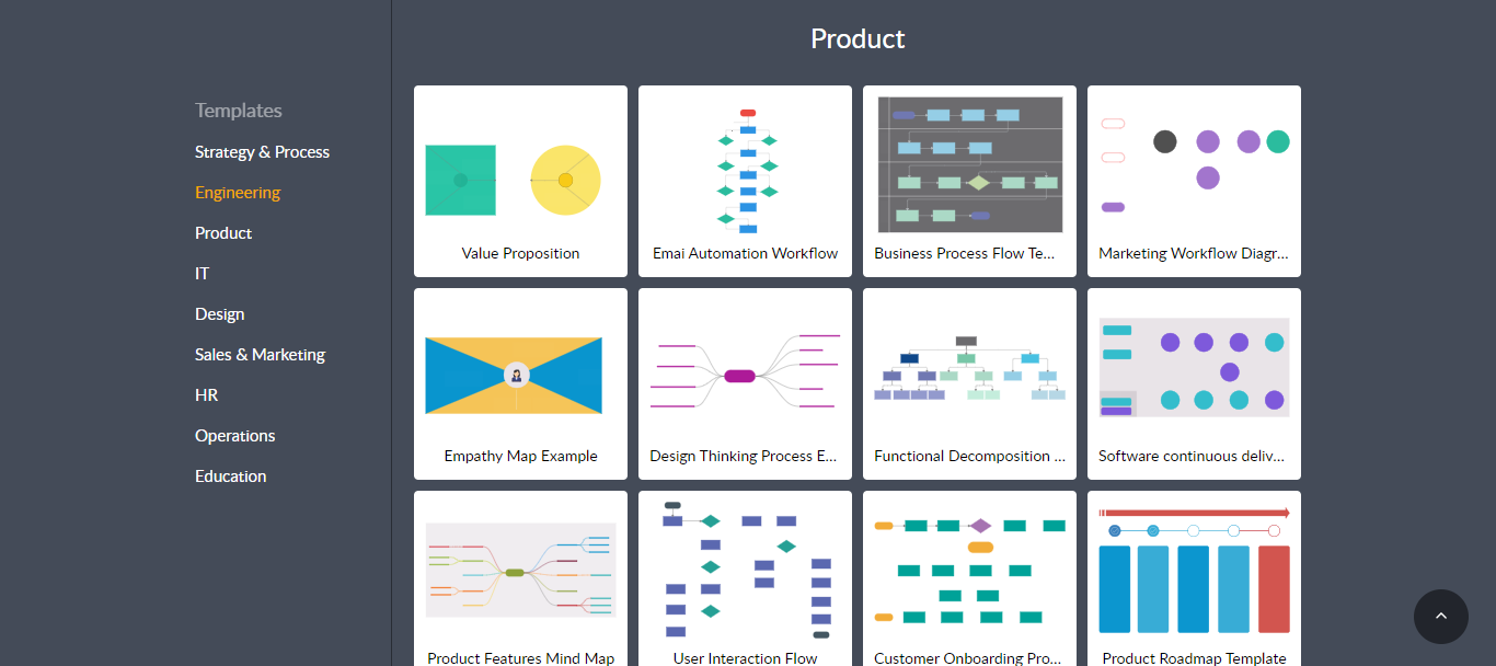 Для создания схемы нужно выбрать шаблон из категорий «Дизайн», «Продажи», «Продукт», «Образование» или самостоятельно добавить необходимые элементы. Можно также загружать свои картинки.