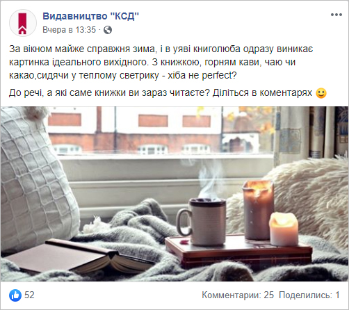Издательство «Клуб семейного досуга» использует стоковые изображения. На примере фотография усиливает текст, вызывая у подписчиков ассоциации с домашним уютом и отдыхом.