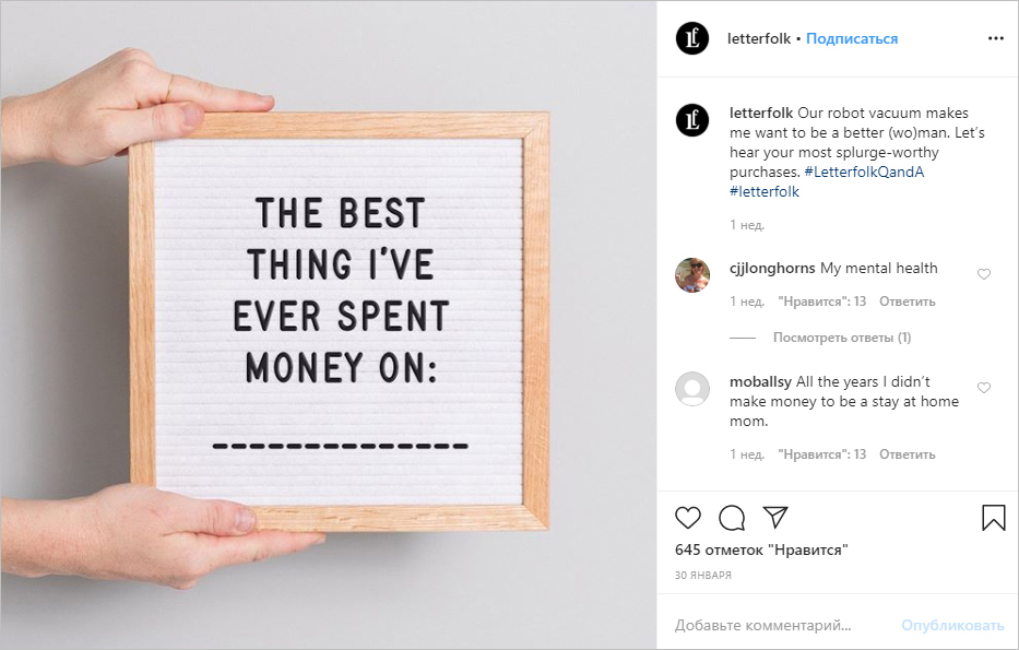 На своей странице в Instagram бренд Letterfolk спросил у подписчиков, какую покупку они считают лучшей в своей жизни.