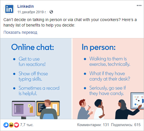 Компания LinkedIn опубликовала инфографику, которая сравнивает преимущества общения между сотрудниками в чате и вживую.