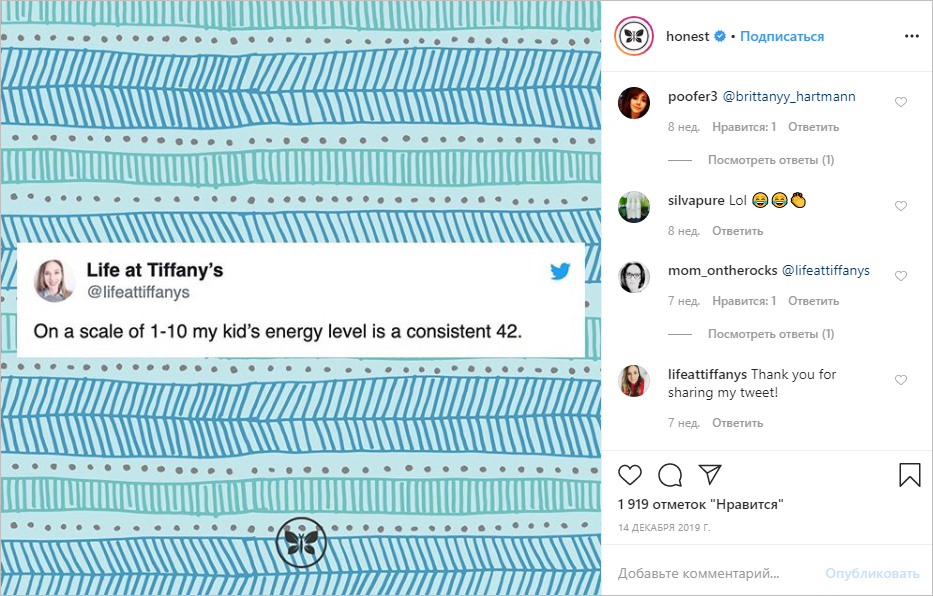 Бренд продукции для мам и детей The Honest Company часто публикует скриншоты забавных твитов на тему материнства от своих подписчиц.