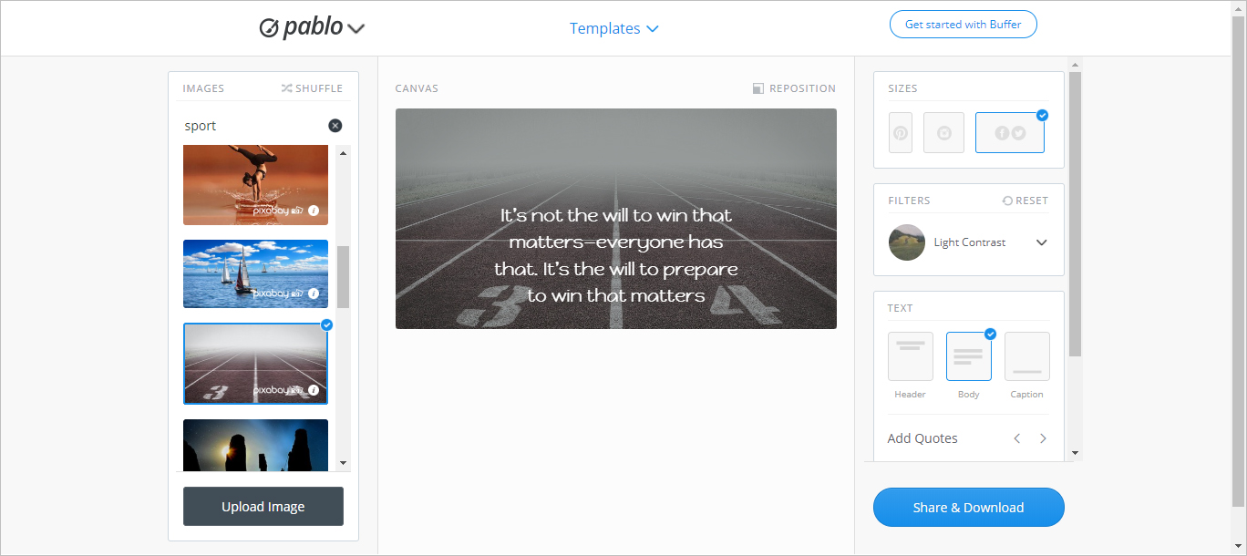 Бесплатные фотографии загружаются из фотостока Pixabay, также можно использовать свои картинки. Нужно выбрать размер холста, шрифт, прописать цитату и скачать файл изображения. Есть возможность менять фильтры и добавлять логотип компании.