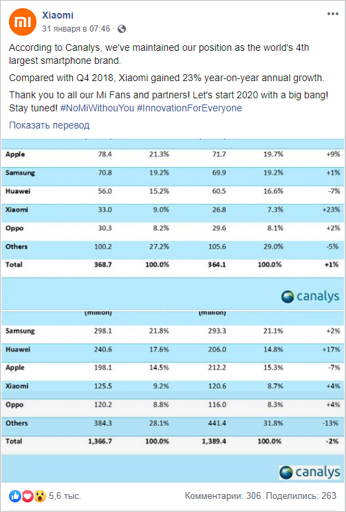 Бренд Xiaomi опубликовал скриншот статистики с авторитетного аналитического ресурса Canalys, чтобы поделиться с подписчиками своими успехами на рынке.