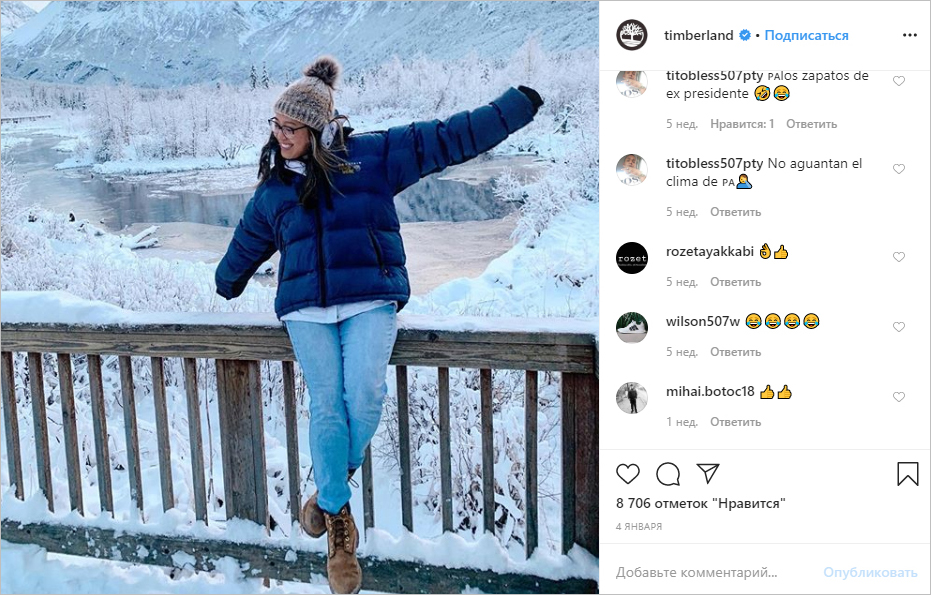Многие бренды показывают на фотографиях свою продукцию. Можно взять пример с компании Timberland, которая публикует не только фото с профессиональных съемок, но и пользовательский контент.