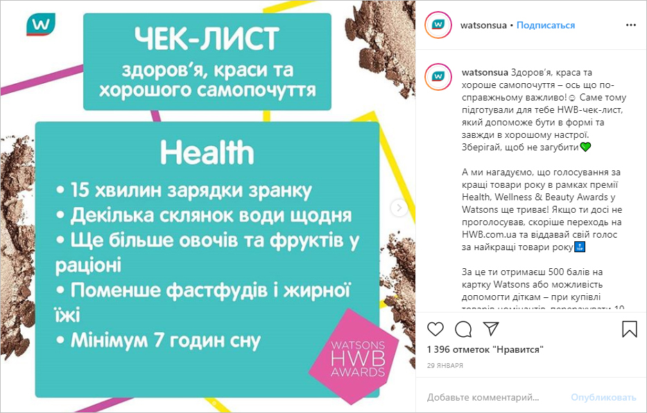 Сеть магазинов Watsons создала для своих подписчиц картинку с чек-листом, как выглядеть и чувствовать себя хорошо.