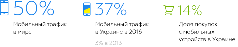 Еще в 2013 году в Украине было всего 3% мобильного траффика. Но с тех пор ситуация сильно поменялась. Внедрение 3G и активное использование смартфонов и планшетов привело к тому, что сейчас, согласно информации Google-Украина, доля мобильного траффика в Украине составляет 37%. А согласно исследованию WayForPay, около 14% заказов в интеренете пользователи совершают с мобильных устройств. И эти цифры постоянно увеличиваются. В мире, уже более 50% всего траффика — мобильный, и в некоторых продвинутых странах уже более 50% заказов совершаются на мобильных устройствах.