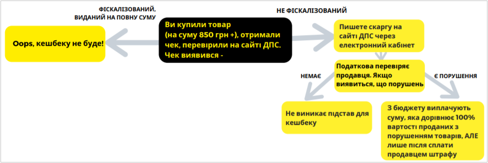 Любой покупатель при покупке свыше 850 грн сможет проверить чек на предмет фискализации. Если тот не фискализирован — он имеет право на полный кэшбек и сохранение товара.
