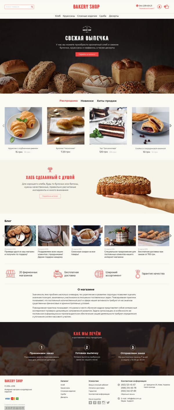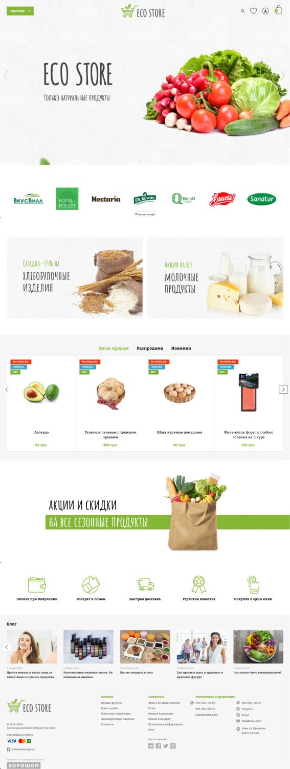 Есть смысл делать побольше баннеров, потому что в продуктовых магазинах постоянные акции. Например, можно использовать один большой баннер со слайдером и несколько небольших. И нет смысла в больших миникарточках товара, ведь основная задача сайта — показать разнообразие продукции.