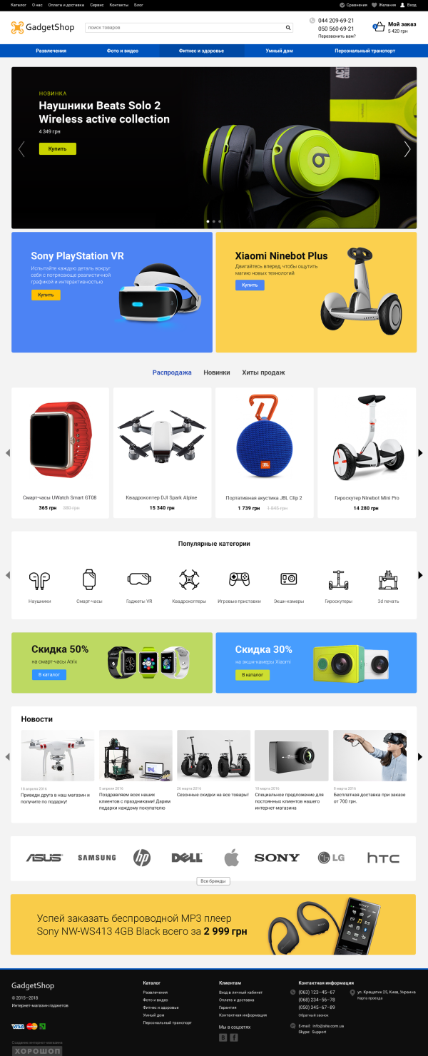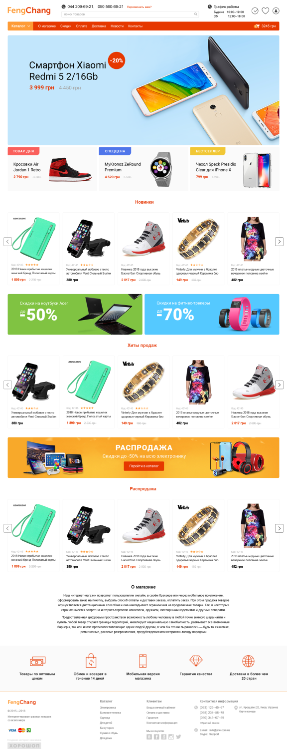 В интернет-магазине электроники можно смело использовать яркие цвета и большое количество баннеров. Миникарточки можно делать не слишком большие, ведь товаров много и главное в них — характеристики, а не фотографии.