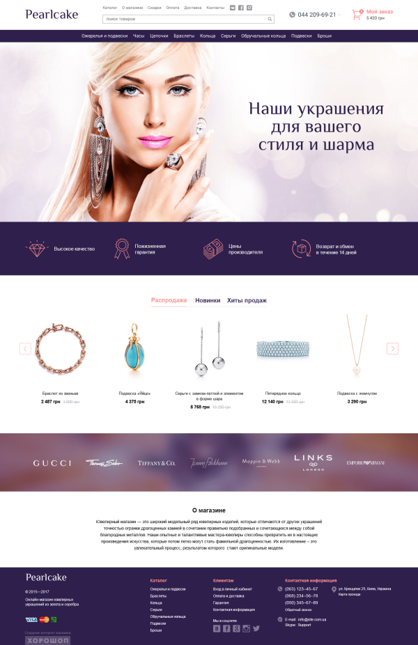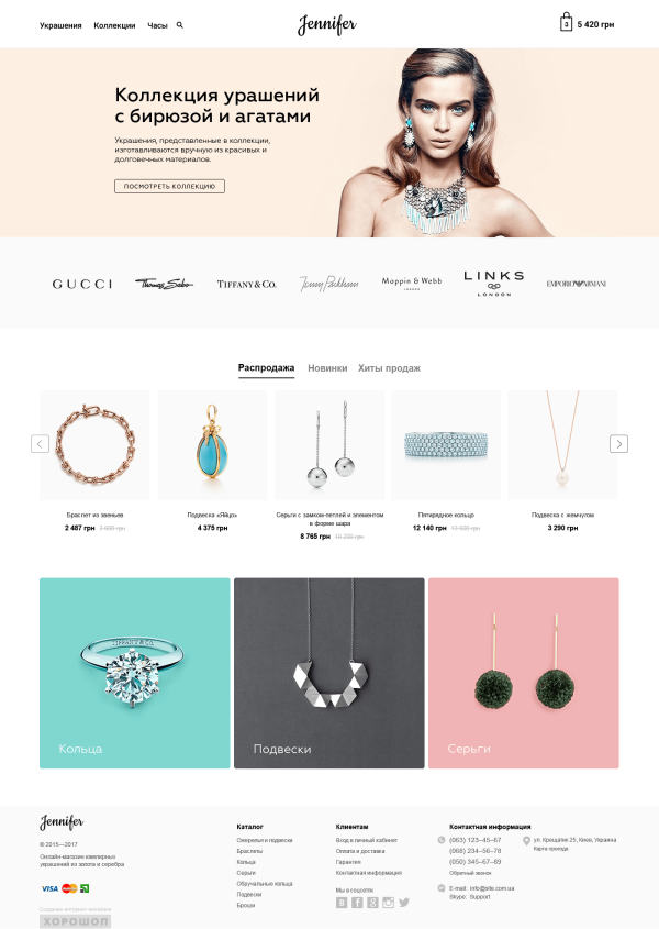 Чтобы продавать дорогие товары вроде украшений, нужно вызывать доверие пользователей с помощью лаконичного дизайна. Фотографии украшений часто имеют предсказуемую цветовую гамму (золото и серебро), поэтому оформление может быть не слишком нейтральным. Можно добавить цвета, которые будут аккуратно сочетаться с фотографиями товаров, например, черный.