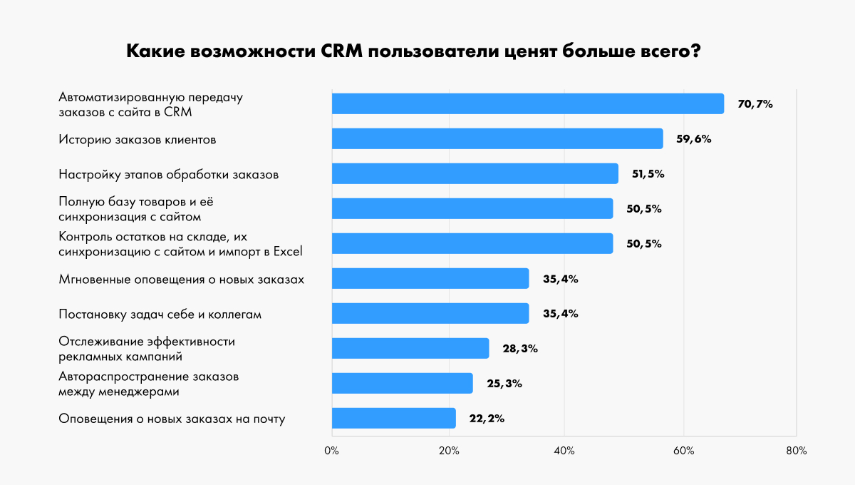 Самые важные возможности: автоматизированная передача заказов с сайта в CRM (70,7%), возможность посмотреть историю заказов клиентов (59,6%) и настройка этапов обработки заказов (51,5%).