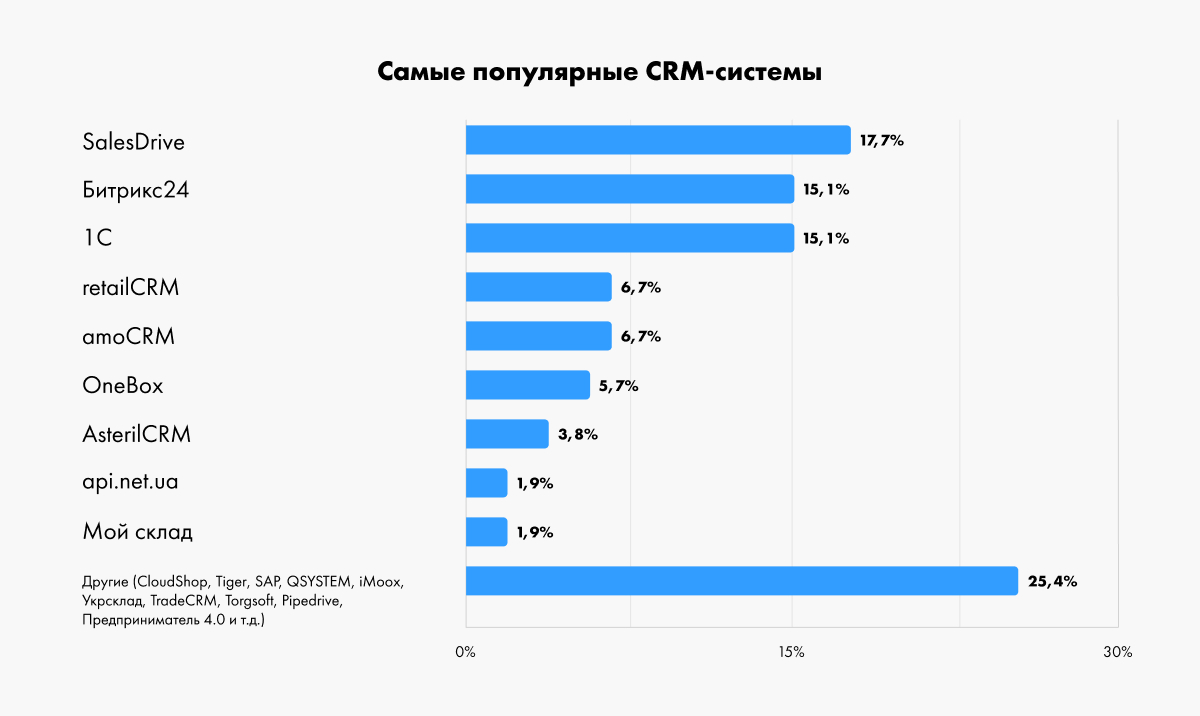 В топ по популярности вошли Sales Drive (17,7%), Битрикс24 (15,1%) и 1С (15,1%).